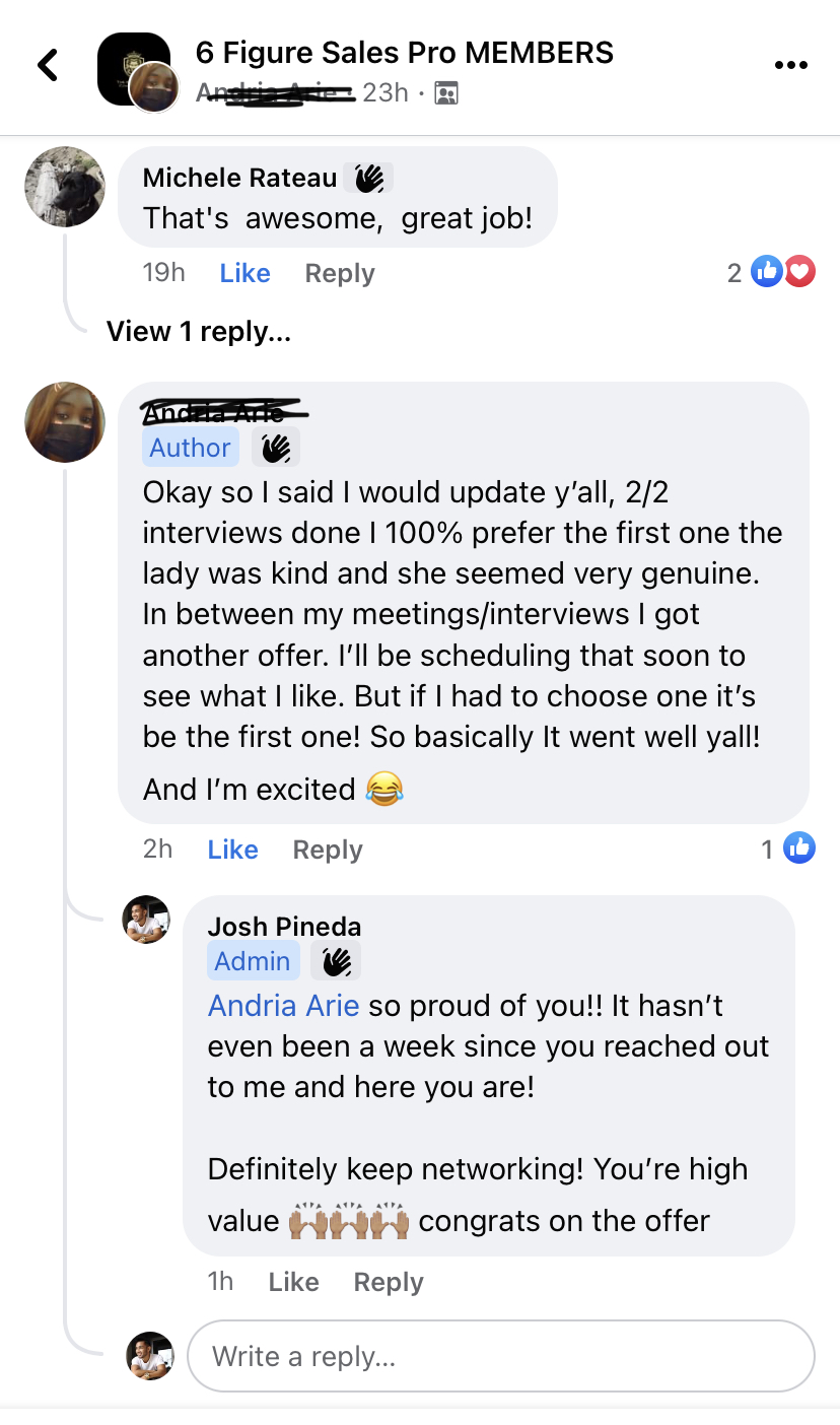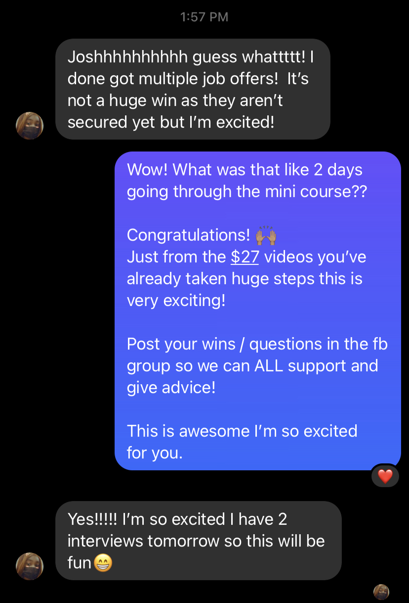 I’ll refund your entire purchase if you haven’t landed any job interviews or aren’t satisfied within the 90 days (provided you show up to coaching calls, follow the steps, and ask for help when you’re stuck. We can get you in the door, but we can’t do the interview for you.)